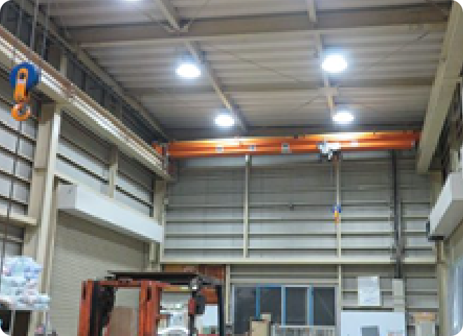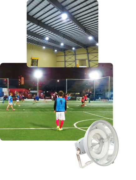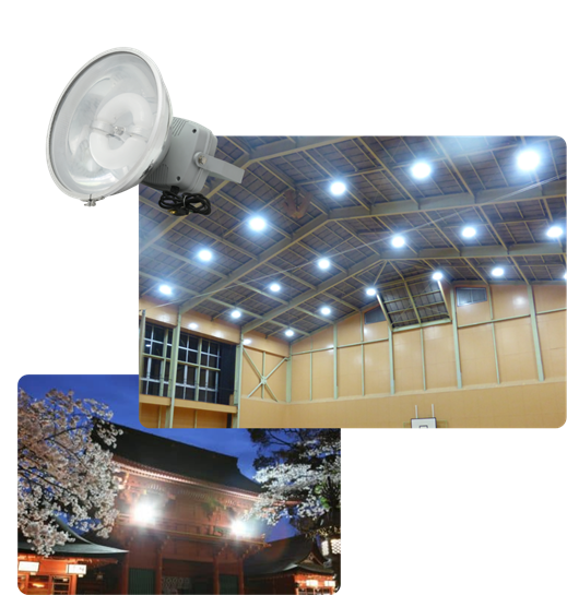工場、倉庫、体育館、屋内スポーツ施設、屋外スポーツコート、ナイター照明などの広域空間や高天井施設に最適です。既存の照明器具と置き換えることも可能で、設置条件に応じたプランをご提案します。