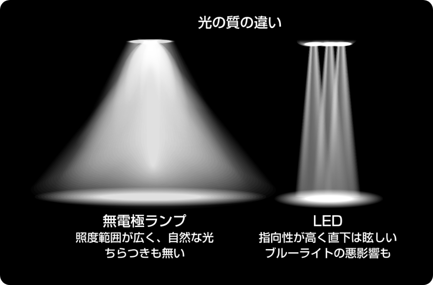 無電極ランプは広い空間でも均一な明るさを実現し、手元や細部もはっきり見えるため、作業効率が向上します。また、チラつきが少なく目に優しい光で、長時間の作業でも疲れにくいのが特徴です。LEDでは光のムラやまぶしさを感じる現場でも、無電極ランプは快適な照明環境を提供できます。